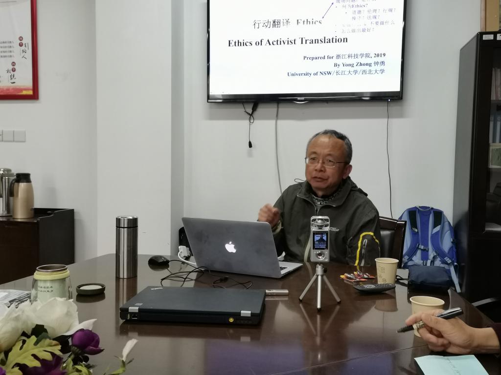 12月6日(周五)下午,应外国语学院/大发彩票 的邀请,新南威尔士大学钟勇教授在闻理园A3-306作了题为“行动翻译操守:基于三个个案的分析”的主题讲座,大发彩票 翻译研究所成员和英语专业学生参加了此次讲座,讲座由外国语学院/大发彩票 院长朱吉梅教授主持。