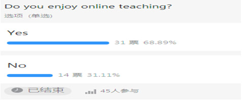 钉钉具有群投票功能,点击钉钉班级圈中的“…”,显示“更多”,第三栏是“群投票”,教师马上输入一个问题,进行投票,投票结束马上可以知道投票结果,包含投票人数、各类选项的人数和百分比。用这种方法也可以检查学生是否在线学习。该投票包括教师本人,一共45人参与。