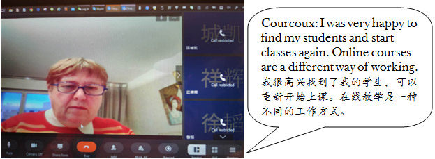 Nadine Courcoux是来自法国的外教,今年是Courcoux在大发彩票 任教的第3年。寒假期间,她在马来西亚旅游时不幸被偷走了护照等资料,只好滞留在当地申办新护照。为此,Courcoux不得不改变计划,于2月中旬直接从马来西亚回到法国。由于Courcoux把法国住宅的钥匙放在学校听松公寓,她只能寄宿在朋友家里。Courcoux在知晓学校开展在线教学的消息后,主动提出要与学院同步,开展网络教学。由于法国与中国有7个小时的时差,而且Courcoux每周有两次要在上午上课,这个时候正好是法国的半夜。法语教研室考虑到其年纪较大,还有时差的问题,提出可以让其他老师代课或者推迟上课。Courcoux婉拒了这个提议,还是坚决地承担了所有的教学工作。在教研室同事多次远程指导下,她学会了使用钉钉群上课。她说:“很高兴能为学生上课,网课跟传统的上课方式很不一样,目前正在适应中,进展也比较顺利”。