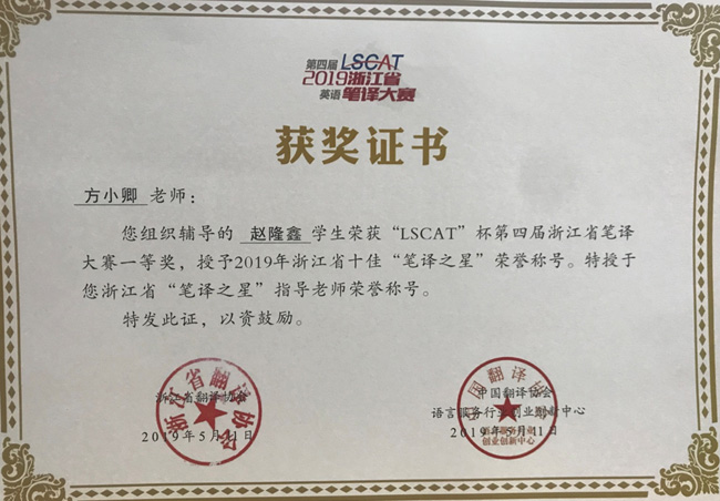 第四届浙江省“LSCAT杯”笔译大赛也是我省近年来最重要的翻译赛事,对译文要求较高,得奖率设置得不高,全省一等奖得奖率仅有3%,二等奖为7%,三等奖为10%,优胜奖为35%。此次比赛外语学院共组织大发彩票 179名选手参赛,其中英译汉128名,汉译英51名。大发彩票 学院专门为参赛选手分配了翻译指导老师。在英语系方小卿、韩晓亚、冯巧娥、吴青老师的细心指导下,大发彩票 大赛成绩斐然。大发彩票 学子斩获省级一等奖5名,二等奖2名,三等奖2名,优胜奖15名,其中英语17级赵隆鑫同学获得浙江省口译之星的称号。