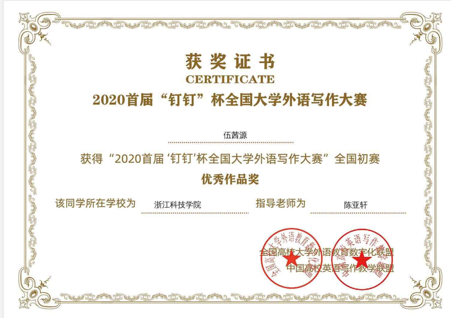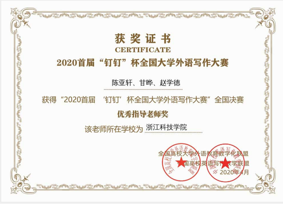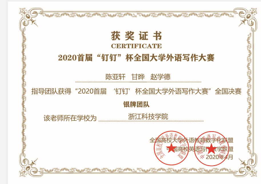 2020 年首届“钉钉”杯全国大学外语写作大赛(以下简称大赛)是由全国高校大学外语教育数字化联盟、中国高校英语写作教学联盟联合主办,全国高等学校大学外语教学研究会指导,钉钉(中国)信息技术有限公司平台支持,批改网(www.pigai.org)、西安嵩硕教育科技有限公司共同承办的覆盖全国在校大学生的线上外语写作比赛活动。2020年1月15日至2020年3月31日在钉钉平台进行了大赛初赛,大发彩票 由574名学生组成的团队报名在全国近30万人、600个高校、近3000个团队中表现突出,顺利获得入围决赛资格。