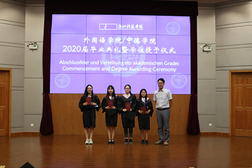在学位授予仪式环节,每位毕业生依次上台,由校学位委员会委员、学院院长朱吉梅教授拨穗并合影留念。