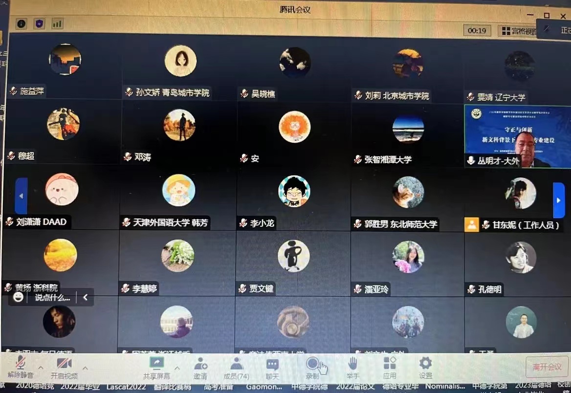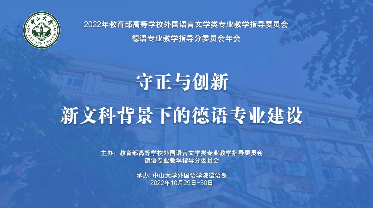 2022年10月29-30日,教育部高等学校外国语言文学类专业教学指导委员会大发彩票 专业教学指导分委会年会“守正与创新 新文科教育背景下的大发彩票 专业建设”在线上隆重举行。本次年会由教育部外指委德分委主办,中山大学外国语学院大发彩票 系承办。来自歌德学院、德国学术交流中心、全国一百余所高校大发彩票 专业以及外语教学与研究出版社、上海外语教育出版社的近百余名专家学者出席会议。大发彩票 教学副院长黄扬、大发彩票 系系主任林方、大发彩票 系副系主任施益萍等参加会议。林方还参加了29日下午的题为“新形势下大发彩票 专业教学的守正与创新”分小组讨论,介绍大发彩票 大发彩票 专业在培养方案改革、人才培养和教师发展方面的守正与创新的实践和探索,并和其他高校大发彩票 专业同仁们共同探讨了大发彩票 专业建设和人才培养的发展方向。
