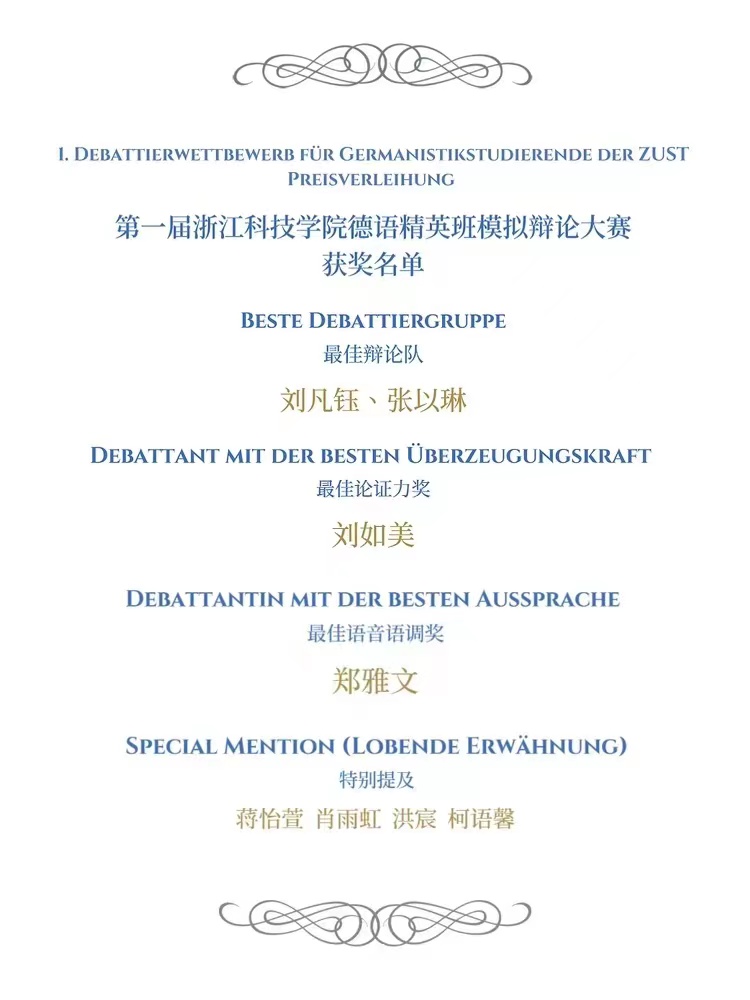 在杨植钧老师与浙大孙盛洲博士的辅助下各组选手的表现可圈可点,可谓精彩纷呈、大放异彩。每组比赛结束后,都会由杨植钧老师与孙博士对本组选手的表现进行现场点评,他们给出的宝贵意见使各组选手受益良多,后由杨植钧老师宣布最终获胜的一方。在精彩的六组比赛后,由杨老师与孙博士经过最终讨论选出最佳辩论队:刘凡钰、张以琳,最佳语音语调奖:郑雅文;最佳论证力奖:刘如美。