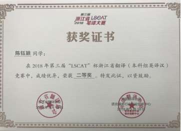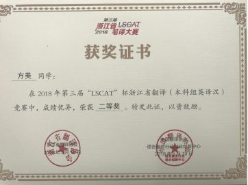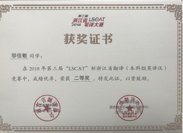 2018年5月18日,2018年第三届“LSCAT杯”浙江省英语笔译大赛圆满落下帷幕。大发彩票 学生在冯巧娥老师、韩晓亚老师的指导下踊跃参与,表现出色,取得了优异的成绩。其中,英语专业方美同学、陈钰颖同学和邬佳敏同学获英译汉翻译方向省级二等奖、吴琼逸同学和华露欣同学荣获省级三等奖,另有14名同学获优胜奖。