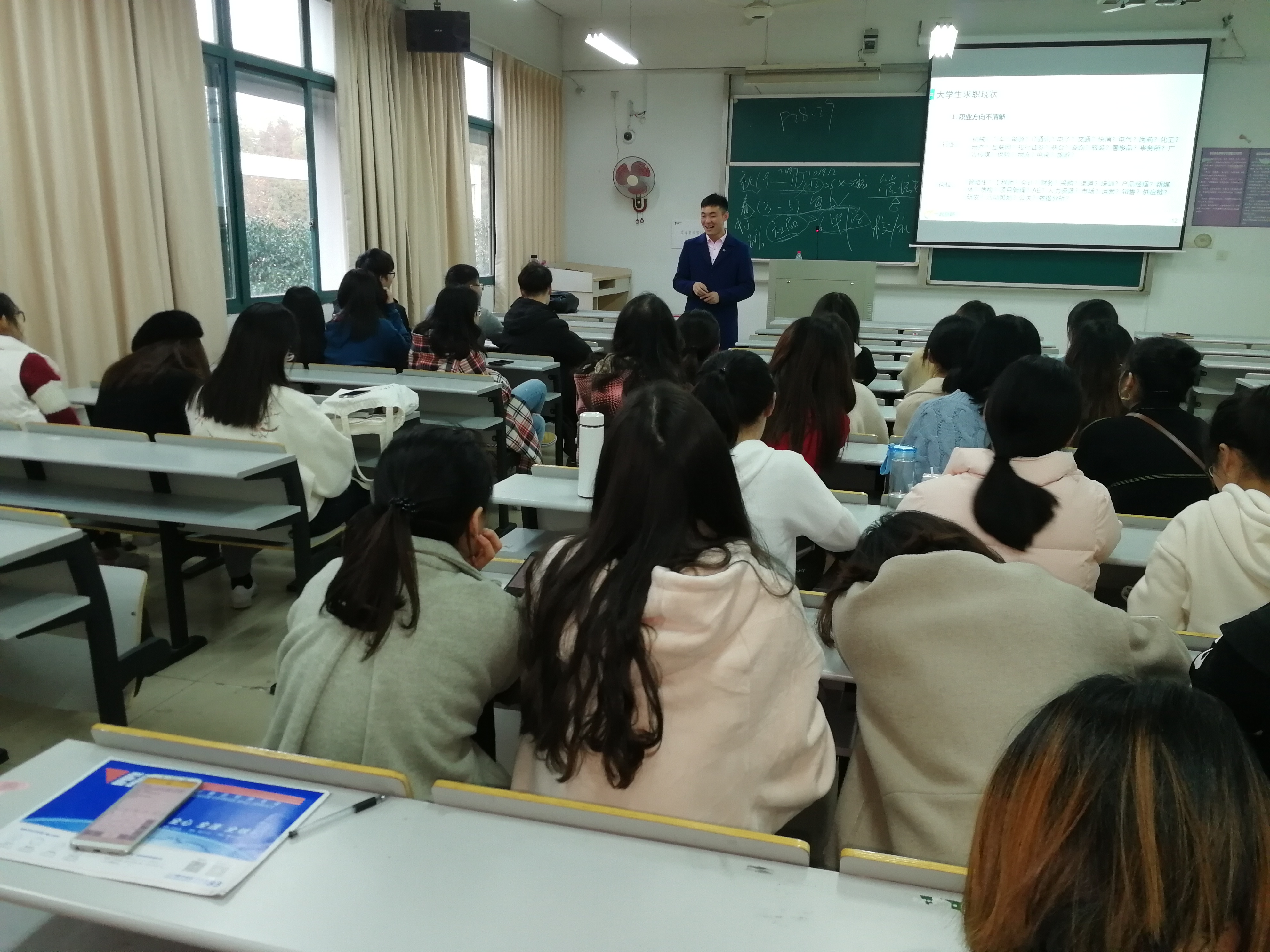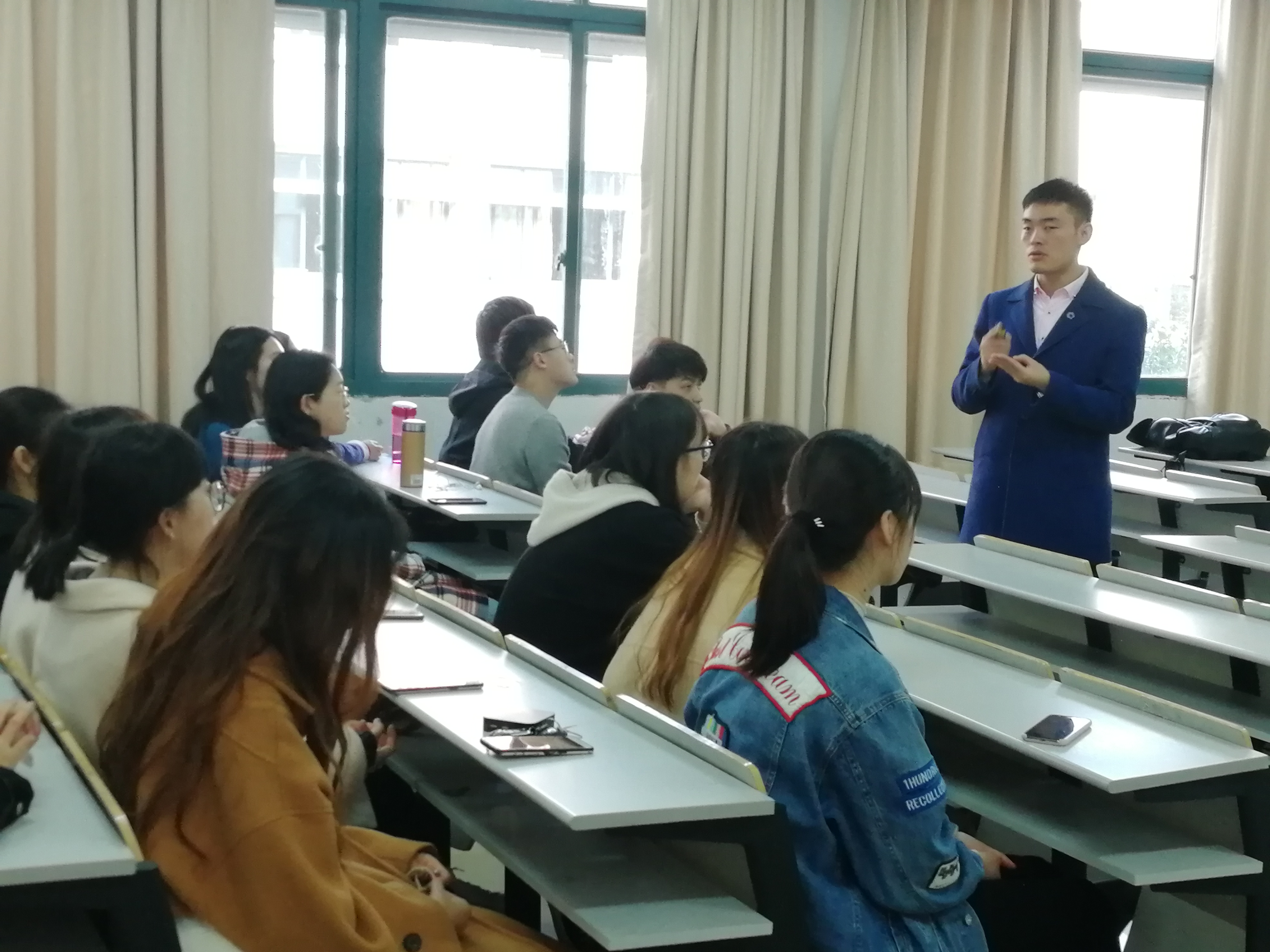 开始,曹老师询问了大家是否有考研的打算,并列举了一些毕业后直接选择就业的好处,他认为如果一味没有方向,只是随波逐流的选择考研就是在浪费自己的时间,毕竟应届毕业生的身份是比较值钱的,同学们也纷纷点头表示赞同。接下来,曹老师就面试的一系列步骤给大家进行了介绍和指导,其中包括简历的格式、内容和就业的行业、岗位灯。其中我们我印象最为深刻的就是,曹老师说在所有行业中快消行业算是工资待遇较好的一项,而且在他的记忆中,很多应届毕业生都想要进入快消行业。在现场参加的同学们也对此非常的感兴趣。