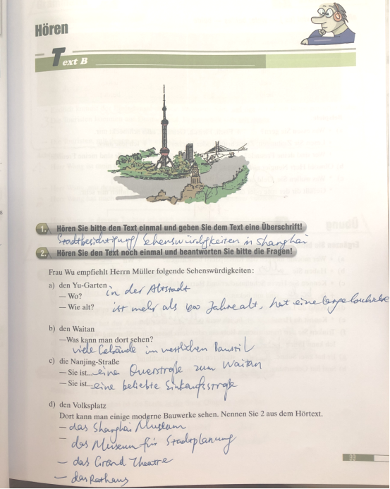 2. 通过主题为“上海之旅”的听力了解上海特色的地标和名胜古迹。听力题目中以特殊疑问词(W-Fragen)提问作为主线,串联起主人公的所见所闻,推进故事情节的发展。学生通过该题不仅强化了听力,也增加了见识,了解中国上海的发展变化,提高文化自信心。完成书本题目后,教师可引导学生结合自己的亲身经历用自己的语言描述自己心目中的上海地标和名胜古迹,从而学会思考如何介绍中国以及塑造中国形象。