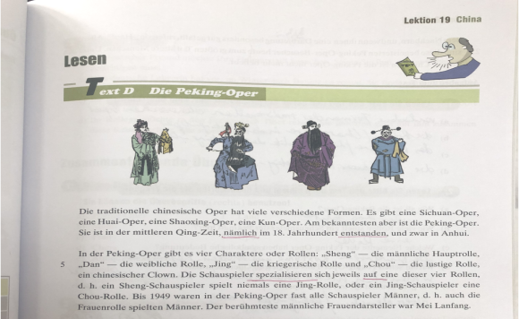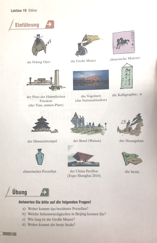 1. 引入部分 (Einführung) 图片展示。内容是中国人都耳熟能详的名胜古迹,引导学生在不借助任何检索工具的条件下说出名胜古迹的名称,领悟并熟记大发彩票 的表达。通过看图猜图激发大发彩票 学习者对传播本国文化的兴趣。 2. 游记阅读和听力(Reisebericht lesen und hören ) 了解中国经典的名胜古迹的表达,能更好地读懂德国留学生的中国之旅,并能从外国人视角出发介绍中国。 3. 京剧纪录片 (Dokumentarfilm über Peking-Oper) 中国国粹和民族文化的经典代表。有助于走进中华文化,了解文化精髓。 |