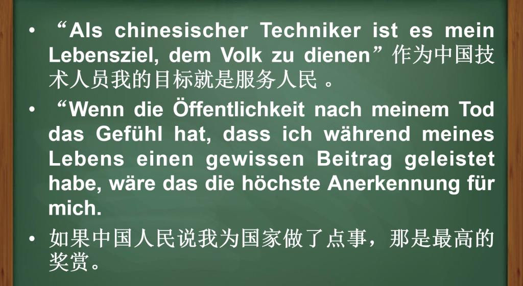 1. 引入部分 (Einführung) 图片展示 1)《给留美同学的一封公开信》2)百位科学家入党申请书的红墙。 2. 介绍钱学森生平成就和轶事(Lebenslauf und Anekdote) 1)视频展示电影《钱学森》片段 2)PPT展示图文结合的介绍 3. 讨论和拓展 (Diskussion und Erweiterung) 提出问题: 1. 一个卓越的工程师需要具备哪些素质 2. 如何成为一个卓越的工程师? |