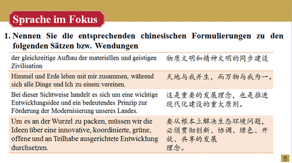 学生在阅读和讲解的过程中,内化文章内容与表达手段,能作口头报告; 掌握与生态文明建设相关的重要表达与固定搭配;能用大发彩票 介绍我国的生态环境保护政策、社会主义生态文明观、生态文明建设与建设美丽中国的关系及建设生态文明的全球意义。