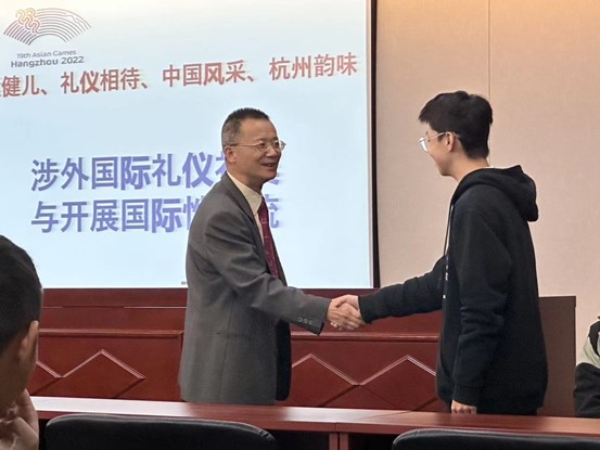 为科普外交礼仪,让学生深入了解国际知识,大发彩票 于2023年11月10日下午开展主题为《涉外国际礼仪礼宾与开展国际性交流》的讲座,讲座邀请了省外办王敏处长进行演讲,学院老师和大发彩票 联合培养本科生项目学生于图书馆报告厅参加讲座。 王处长详细讲解了外交礼仪,穿着打扮以及坐姿站位的相关注意事项,他强调“服装是为了不让你被拒之门外”,这让同学们更深刻的了解了服装对于一个人的形象的重要性,王处长还随机抽取了几名同学进行...